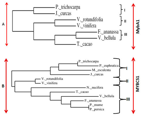A phylogenetic tree based on amino acid alignment of VrMybA1 and VrMYBCS-1 and related proteins with SANT (Swi3, Ada2, N-Cor, and TFIIIB) and MYB domains was constructed using the neighbor-joining method of MEGA 4.0 [48]. The dendrograms indicated that VrMybA1 and VrMYBCS1 belong to a distinct cluster of MYB proteins from Vitis species (Figure 5A,B). MybA1 from different organisms were divided into three groups: I, II, and III (Figure 5A), and MYBCS1 was also divided into three groups: I, II, and III (Figure 5B). VrMybA1 from V. rotundifolia belonged to the subgroup II that is close to the V. vinifera and MYBCS1 from V. rotundifolia belonged to the subgroup II, which is also in the same clade as V. vinifera. Even though members of each subgroup have close relationships, the study of this relationship through phylogenetic analysis has enabled us to visualize how evolution has produced changes in the MYB gene family.