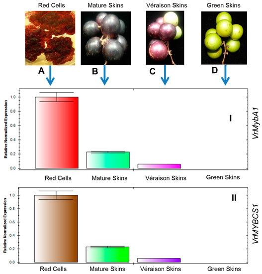 Plant samples used in the experiment (A) (Red cells); (B) (Mature berries); (C) (Veràison berries); and (D) (Green berries) and mRNA expression levels of VrMybA1 (I); and VrMYBCS-1 (II) genes in different developmental stages of muscadine grape berry skins. The values are expressed relative to a level of transcription (I) the veràison, which was set as 0.1. Values are the means of three replicates ± SE.