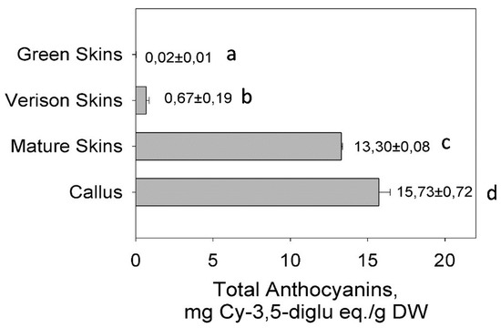 Approximately 2 g of fresh tissue (callus and/or skins) were kept frozen at −80 °C, then homogenized with Bio Homogenizer (Biospec Products, Inc., Bartsville, OK, USA) at 5000 rpm for, 5 min, in 10 mL extraction solvent (Methanol: 1% HCl—1:1). It was then centrifuged for 15 min (4 °C) (Eppendorf 5804R, Swedesboro, NJ, USA) at 11,000 rpm. The supernatant was collected and the residue was homogenized and re-extracted two more times. The extract was combined and filtered through a 0.45 µm syringe filter and used for total anthocyanin assay.