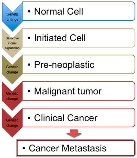 Cancer can be viewed as a gradual generation and development of a tumor, which from a functional perspective can be divided into three phases: initiation, promotion and progression. Genomic changes such as point mutations, gene deletion and amplification and chromosomal rearrangements, all mark initiation, subsequently committing the cell to an irreversible status. In order for a tumor to be formed however, survival and clonal expansion of these initiated cells is required (Figure 1). Growth of tumor and metastasis (if it occurs) are characteristics of the progression phase. Development of cancer is a multistage process involving multiple genetic and epigenetic events occurring at varying rates. In order for cancer to develop, the acquisition of all six properties below is required: (i) self-sufficient proliferation; (ii) insensitivity to anti-proliferative signals; (iii) evasion of apoptosis/T-cell control; (iv) unlimited cellular replication ability; (v) maintenance of vascularization; and (vi) tissue invasion and metastasis. These alterations result from a combination of proto-oncogene activation, inactivation of tumor suppressor genes and inactivation of genomic stability genes.