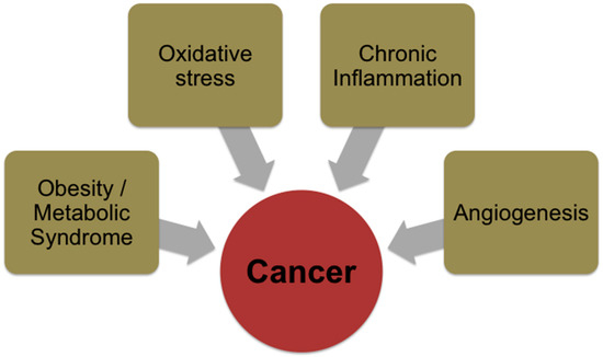 Several conditions and/or mechanisms that function as risk modulators for cancer including oxidative stress/chronic inflammation, obesity/metabolic syndrome, angiogenesis, apoptosis, autophagy and proliferation, have been proposed to explain cancer. Depending on the type/case of cancer any of the above and/or a combination may lead to cancer manifestation or progression (Figure 2). There is however no definitive mode of action via which cancer is initiated and hence prediction of cancer occurrence is not possible, while from a statistical standpoint cancer prevention is possible to a certain degree.