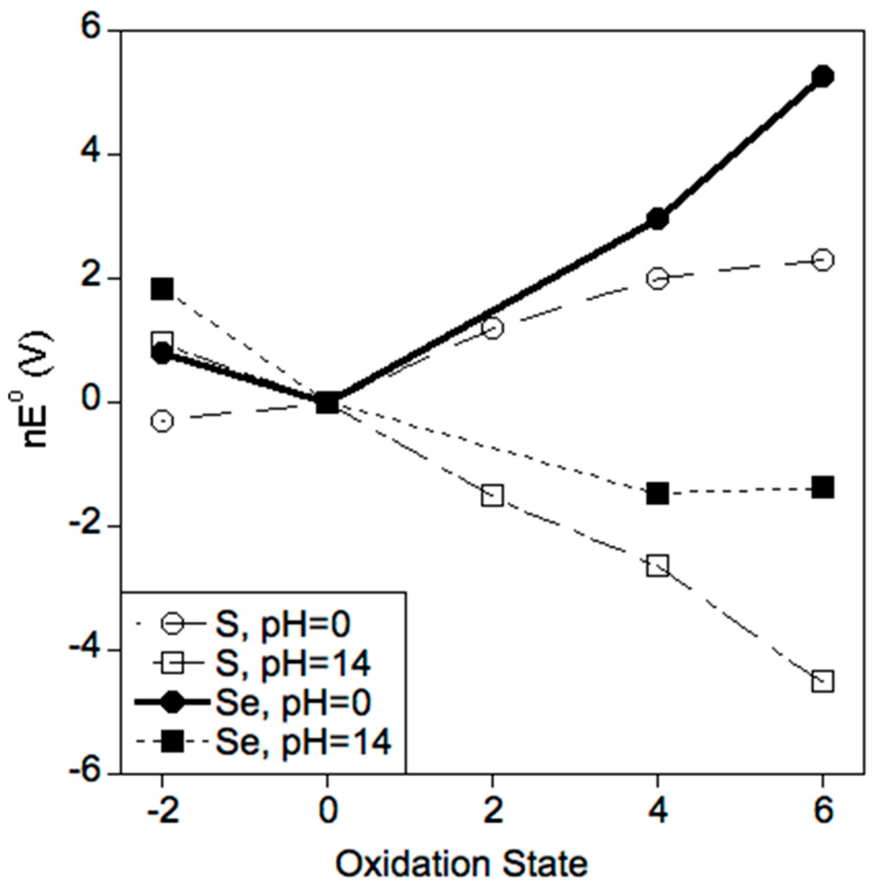 The ionization energies of Table 1 suggest Se is easier to oxidize than S. This fact is further evidenced in the Frost diagrams of Figure 1 [53,54]. Thus, for a particular pH (0 or 14) and a given oxidation state (−II to +VI), Se is more easily oxidized than S. Note the general trend that oxidation potentials increase with oxidation states at low pH and they decrease with oxidation state at high pH. These trends are due to the effects of the proton states of the species involved. Finally, note that the most stable oxidation state at pH 0 for S and Se are −II and 0, respectively.