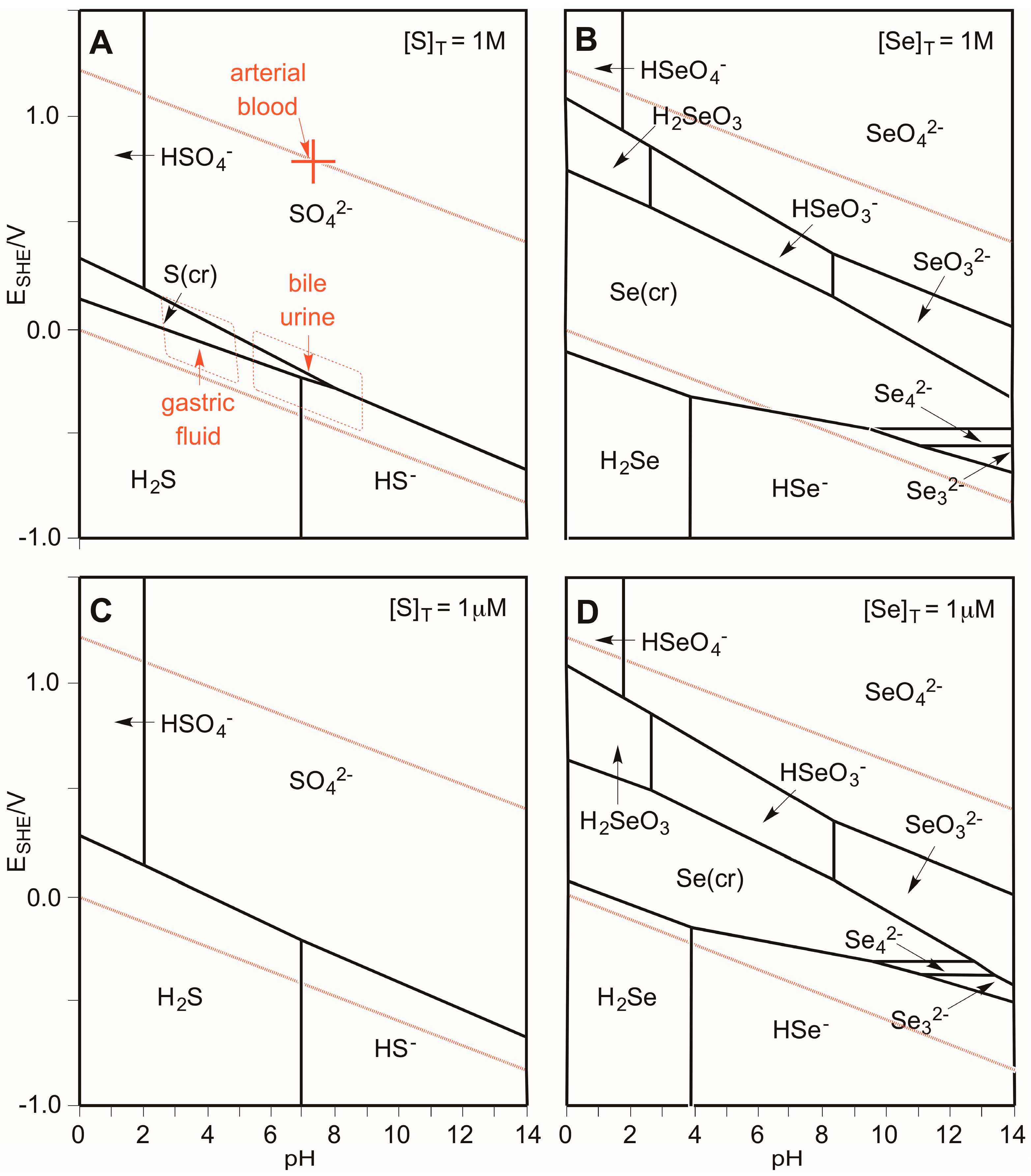 Pourbaix diagrams for S (A and C) and Se (B and D) at 1M total chalcogen (A and B) and 1 μM total chalcogen (C and D) at 25 °C. The red lines define the stability region of water. Various physiological fluids are illustrated (A) [55].