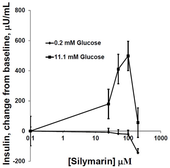 Insulin levels secreted by HIT-T15 cells in static incubations in buffer containing either 0.2 or 11.1 mM glucose for 2 h in the presence of increasing concentrations of SIL. No increase in insulin levels was observed using the non-stimulatory glucose concentration of 0.2 mM with or without inclusion of SIL in the incubate. However, in the presence of 11.1 mM glucose, an increase in baseline insulin was observed as well as augmentation of this increase by increasing concentrations of Silymarin, with a maximum effect 100 µM SIL (p < 0.01) and a decrease in response when using 200 µM. Data = mean ± SE; n = 8 experiments.