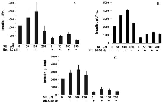 Insulin secretory responses from HIT-T15 cells in 2 h static incubations containing 11.1 mM glucose in increasing concentrations of SIL with and without three inhibitors of exocytosis. (A) Epinephrine (1 µM); (B) Nifedipine (20–50 µM); (C) Diazoxide (50 µM). In all experiments, SIL 50–100 µM augmented glucose-stimulated insulin secretion (GSIS), an effect that was maximum at 100 µM SIL. In all cases, this response was significantly decreased when the three inhibitors of exocytosis were present (all p = < 0.05–0.001). All experiments performed using three to five experiments. Data = mean ± SE.