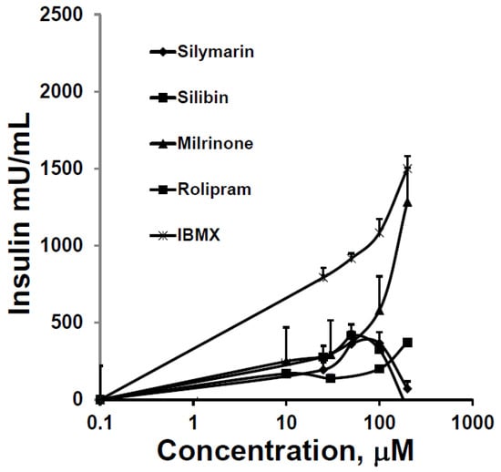 SIL and silibin stimulatory effects on GSIS were quantitatively similar to each other, greater than that of rolipram, and substantially less than that of milrinone and IBMX (Figure 5).