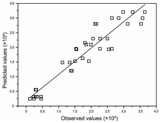 Plot of observed values vs. predicted values. Response values are power transformed y2. R2 = 0.8992.
