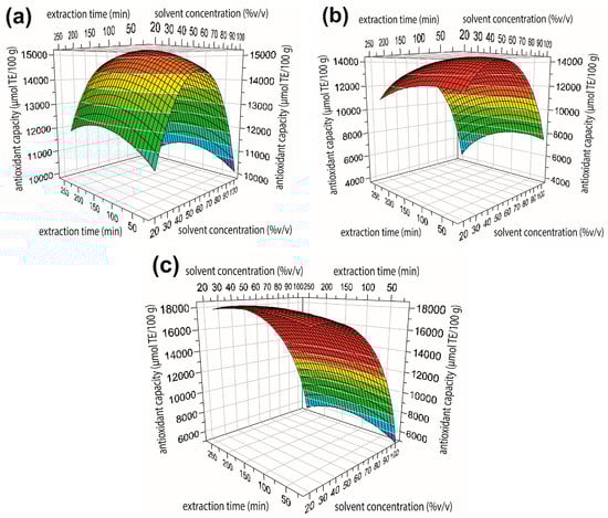 Response surface maps plotting x2 solvent concentration vs. x3 extraction time, with (a) x1 methanol; (b) x1 ethanol; and (c) x1 acetone.