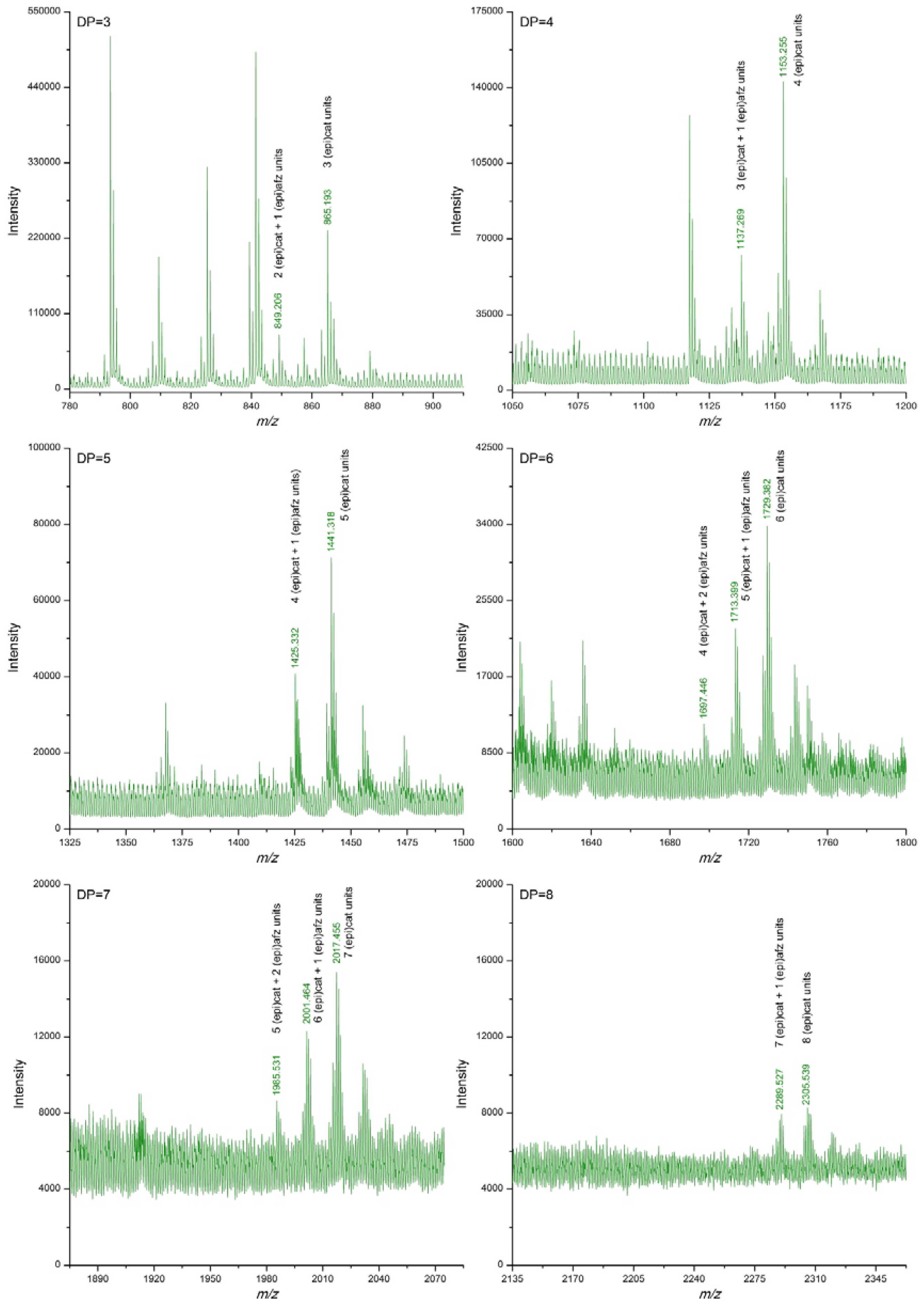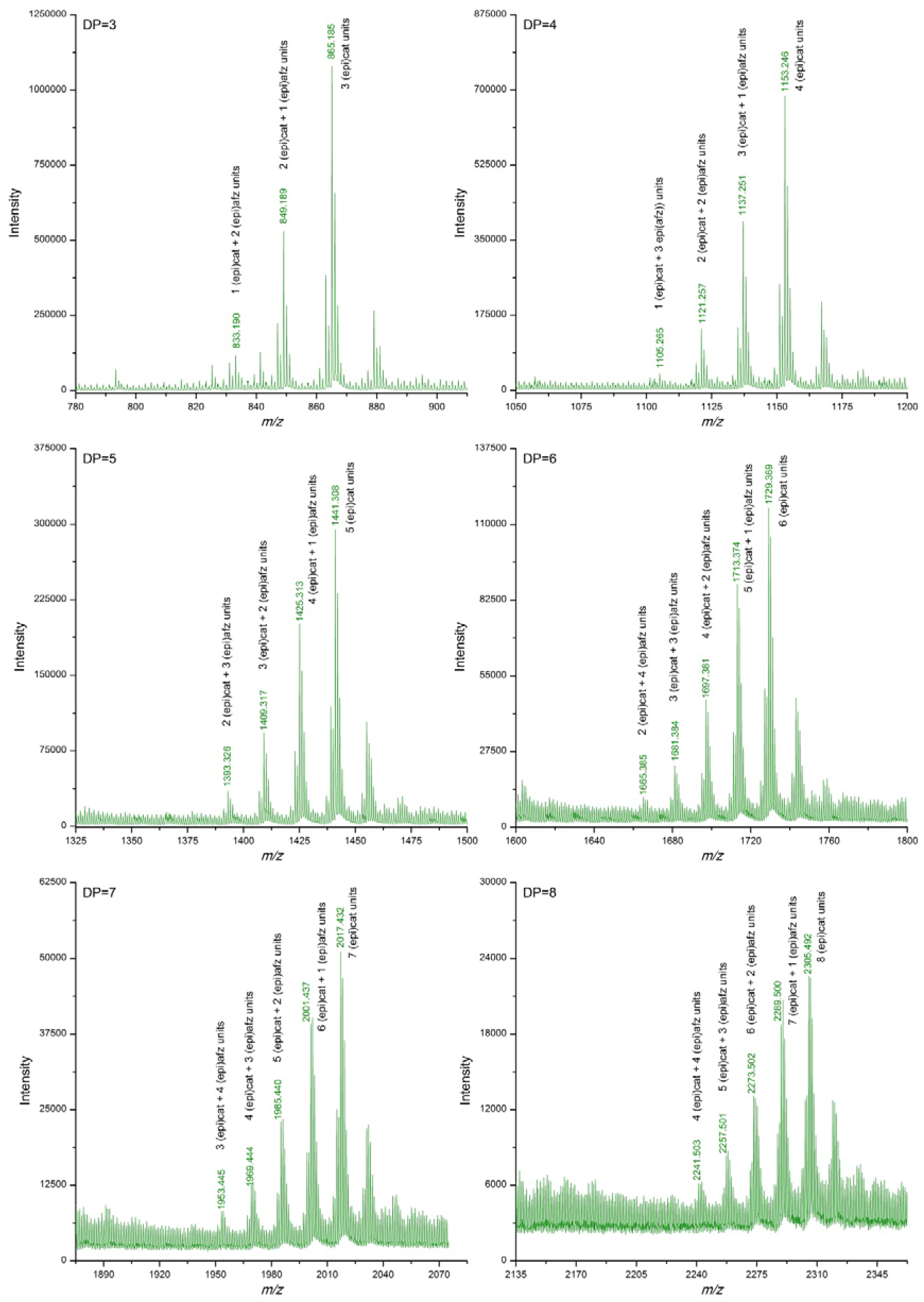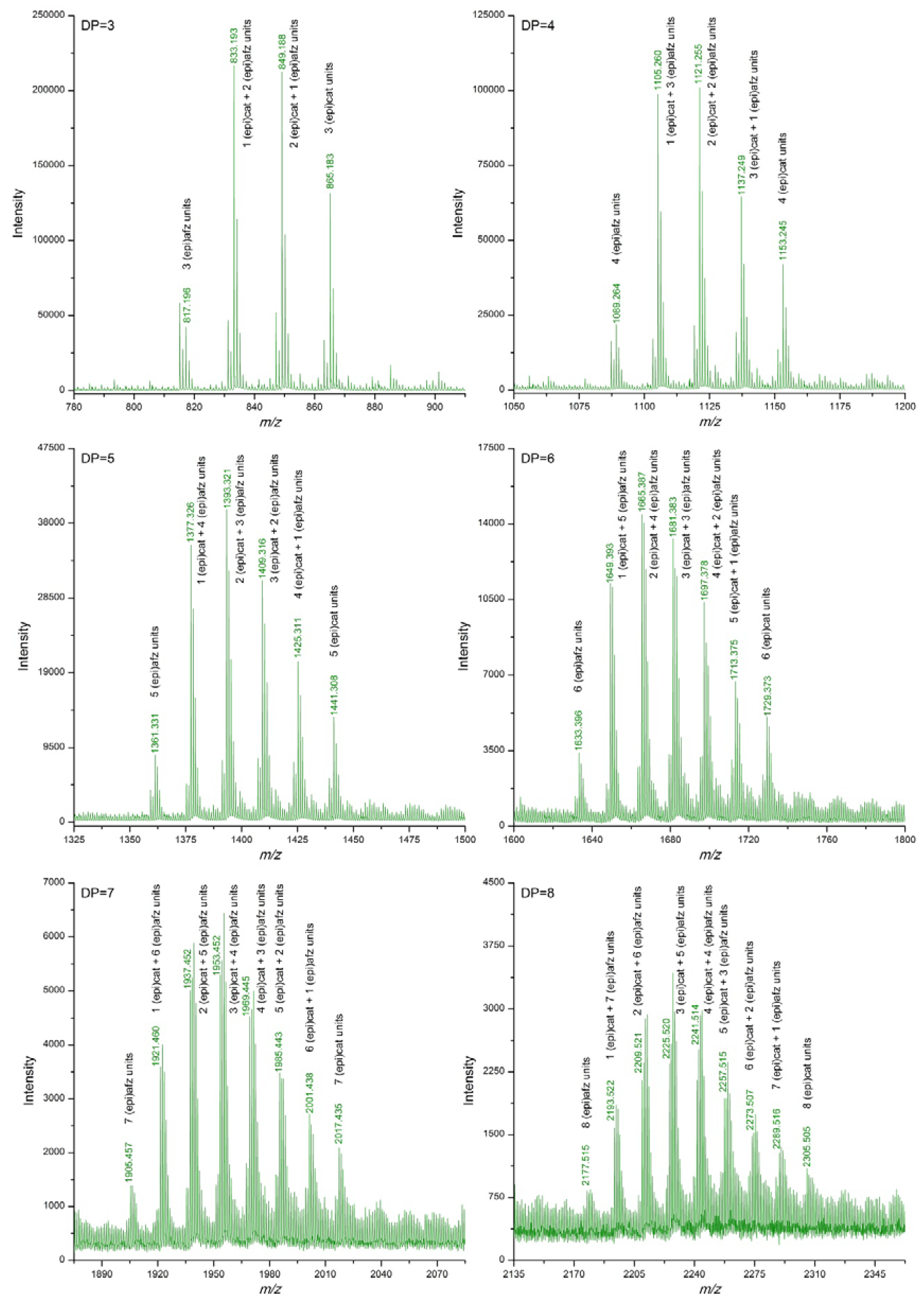 | DP | (epi)cat | (epi)afz | m/z Theoretical [M−H]− | m/z Experimental [M−H]− | |||