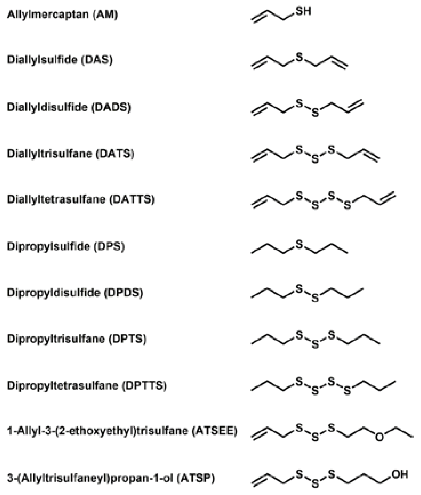 Names, abbreviations and chemical structures of the various sulfur compounds selected for this study. These compounds include a set of different diallylsulfanes found in garlic, dipropylsulfanes found in onions, a reduced mercaptane as a reference and two synthetic derivatives with higher stability, solubility and less odour. It should be noted that the use of the nomenclature of organic and inorganic polysulfide/polysulfane species is still somewhat confusing. In line with the common “taxonomy” of negatively charged anions and hydrogen sulfides, we will therefore for the time being use the expression “sulfide” and polysulfide for anionic, inorganic species of the composition HSx−/Sx2−, and the expression “sulfane” for organic, uncharged molecules RSxR’, in analogy to “alkane”.