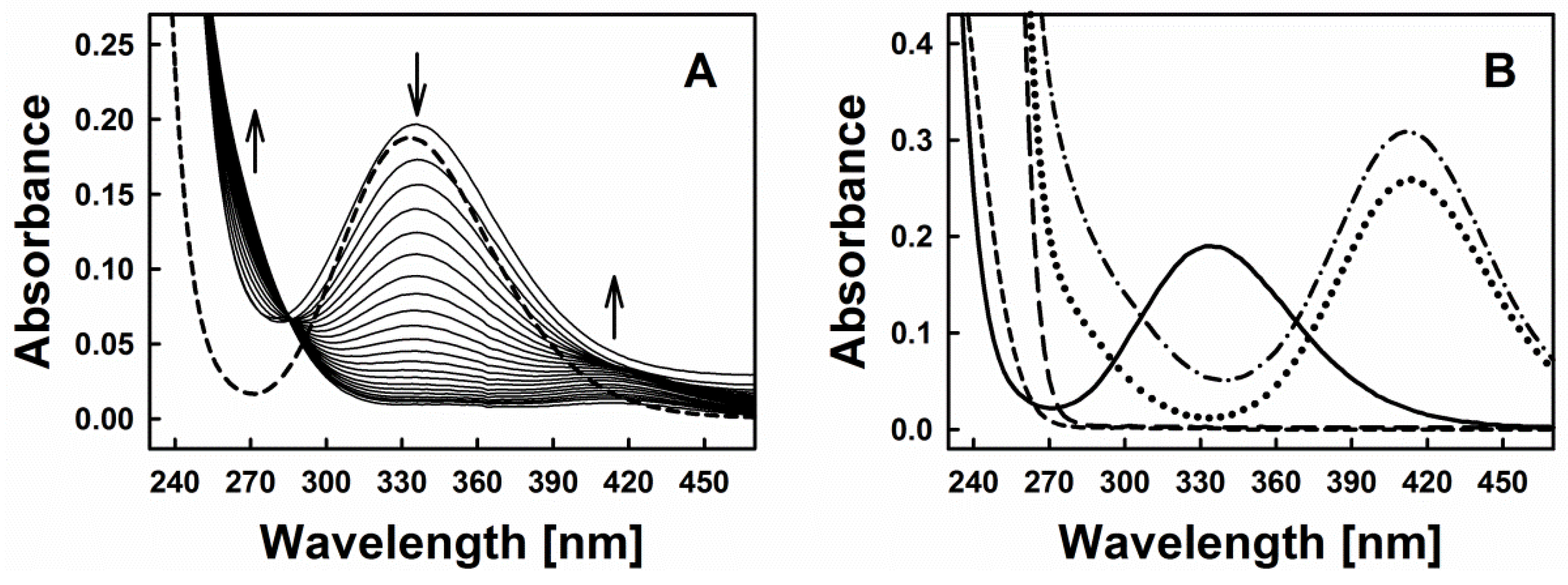 Figure 2A represents time-resolved absorption spectra indicative of the interaction of diallyltrisulfane (DATS) with GSNO and Cys. Based on the typical spectra of GSNO itself or its interaction with excess of sulfide (Figure 2B), we decided to investigate the spectral changes at 270, 334 and 412 nm, which were assigned to the formation of inorganic polysulfides or organic hydroper- and polysulfides (270 nm), decomposition of GSNO (334 nm, ʎmax(GSNO)) and formation of the nitrosopersulfide (perthionitrite, SSNO−) anion (a rather colourful yellow species with ʎmax at 412 nm) [10,13,14]. It should be mentioned that inorganic per- and polysulfides, as sulfane-sulfur species, show a typical broad absorption spectrum in the range of 260–420 nm (as reported in the literature, e.g., [15]). We intentionally chose 270 nm due to an absorption minimum of GSNO at that wavelength. It should also be noted that also other possible interaction products may contribute to this absorption signal, still we presume that changes at this specific wavelength primarily reflect the formation of inorganic polysulfides or organic hydroper- and polysulfides. Here, our assumption is based on a comparable absorbance of SSNO− at 270 nm and 412 nm (Figure 2B—dotted line, experiment with dithiothreitol (DTT)) and on the fact that in our experiments the absorbance at 412 nm is significantly smaller when compared to the absorbance at 270 nm (~0.01 vs. ~0.06). We have also performed spectral corrections to the light scattering of the DATS sample (A510 nm), the contribution of absorbance of polysulfides at 334 nm and the GSNO absorbance at 412 nm. Eventually, kinetic traces at 270 nm reflect the changes of absorbance at this wavelength after addition of Cys to the mixture of GSNO plus organic polysulfanes, kinetic traces at 334 nm reflect changes due to GSNO decomposition and kinetic traces at 412 nm indicate the predicted absorbance of SSNO− formed during the reaction.