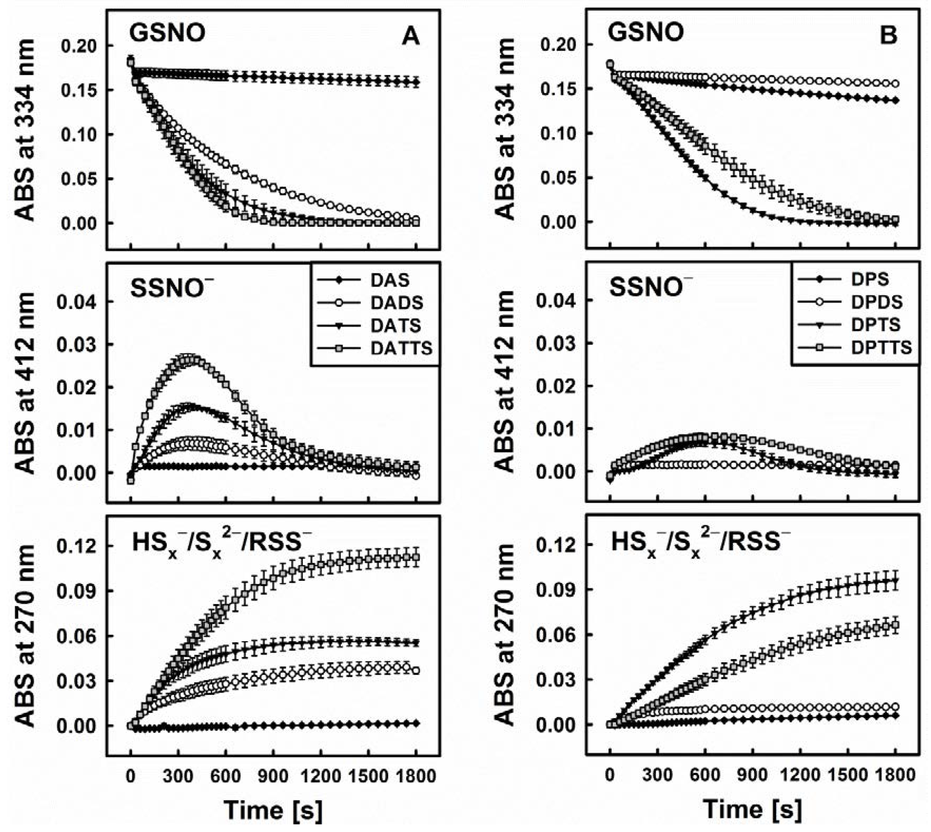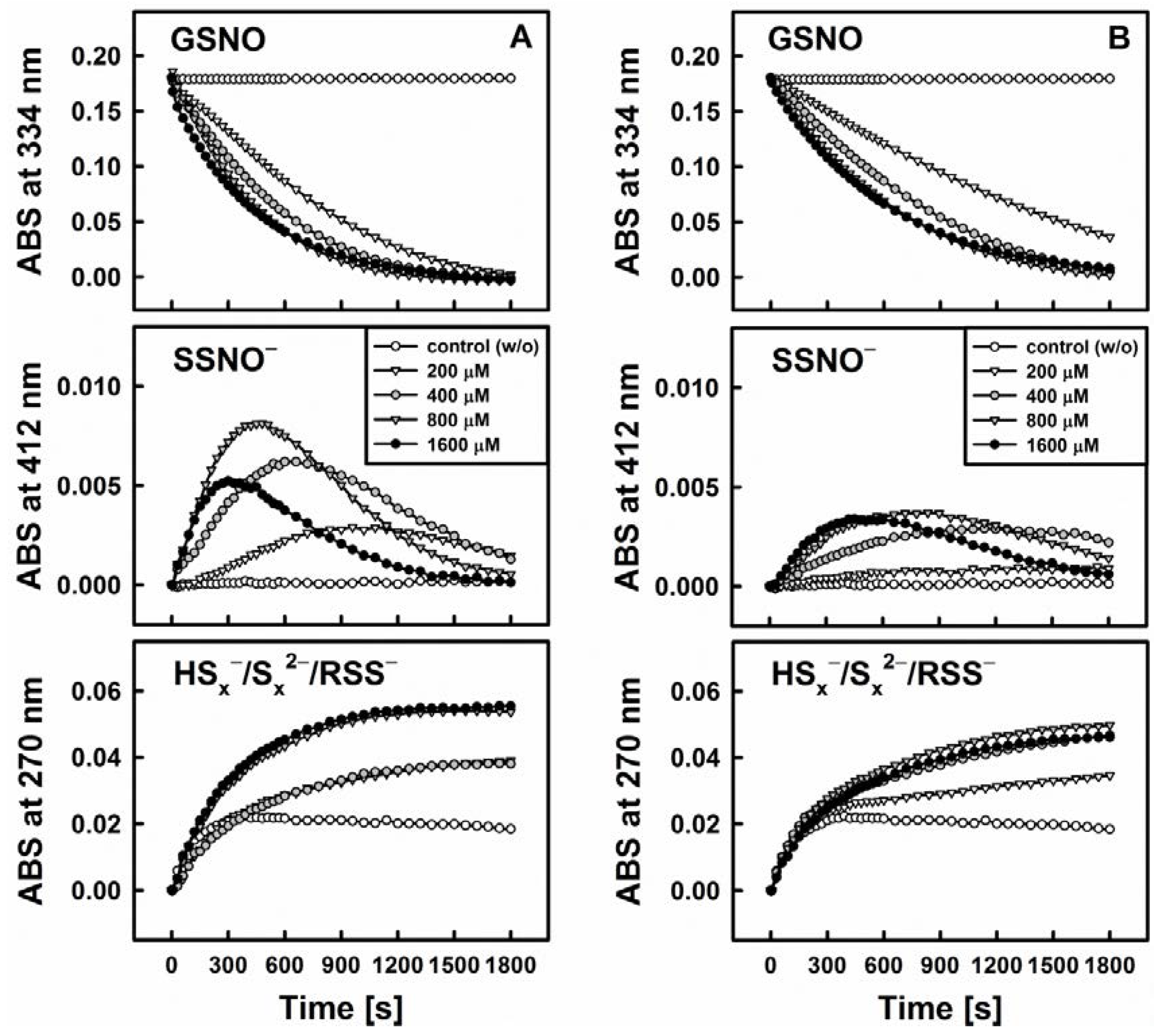Kinetic traces of the interactions of 200 µM DATS with 200 µM GSNO in the absence and presence of various concentrations of cysteine (Cys, left, A) and reduced glutathione (GSH, right, B) monitored at three characteristic wavelengths by UV/VIS spectrophotometry (334 nm—GSNO decomposition, 412 nm—formation of SSNO−, 270 nm—formation of hydroper-/polysulfides). The maximum rate of GSNO decomposition was achieved at concentrations of 800 or 1600 µM Cys/GSH.