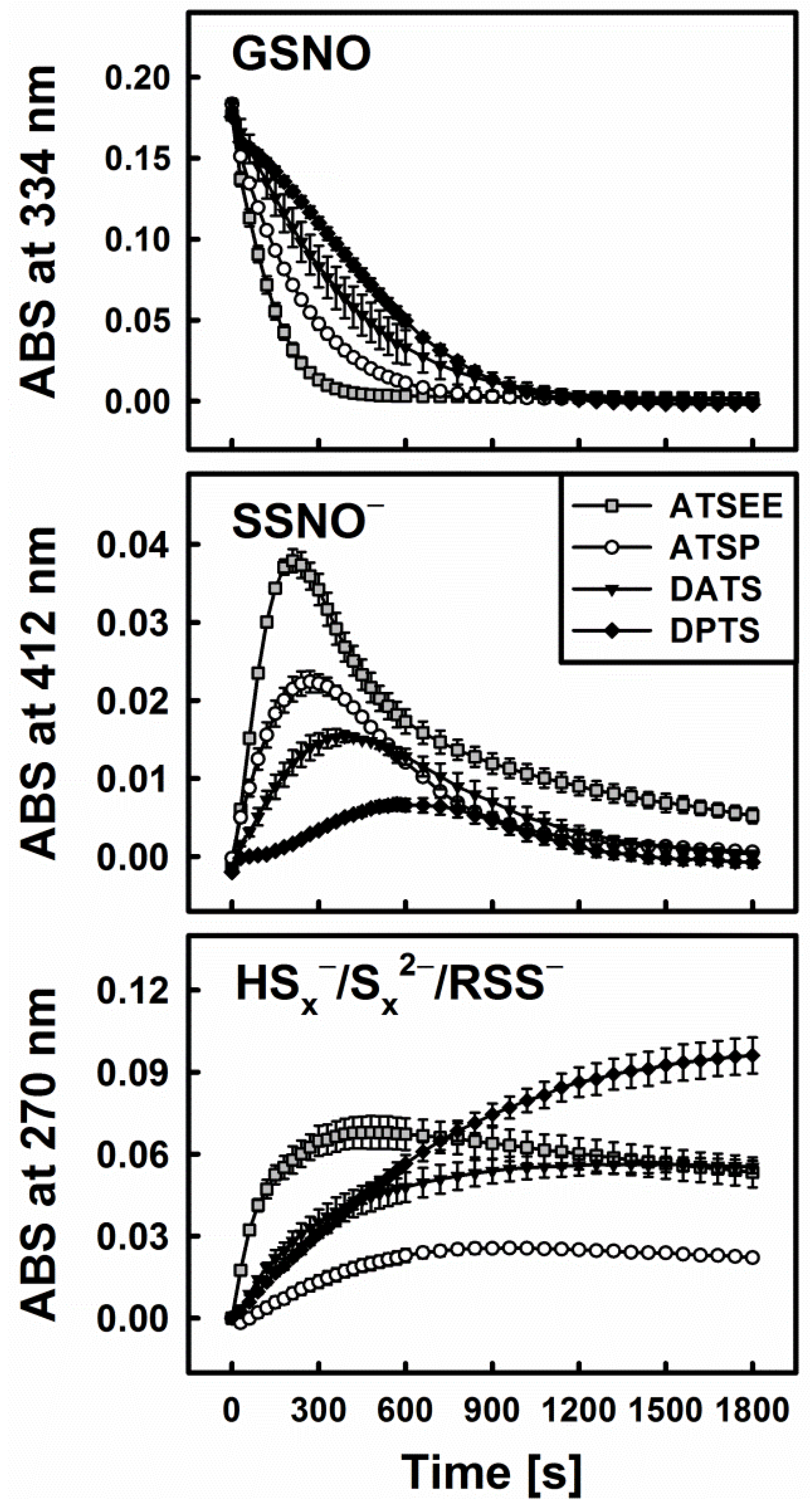 Kinetic traces of the interactions of 200 µM of synthetic trisulfanes ATSP and ATSEE, respectively, with 200 µM GSNO in the presence of 800 µM Cys. The traces for DATS and DPTS are shown for comparison.