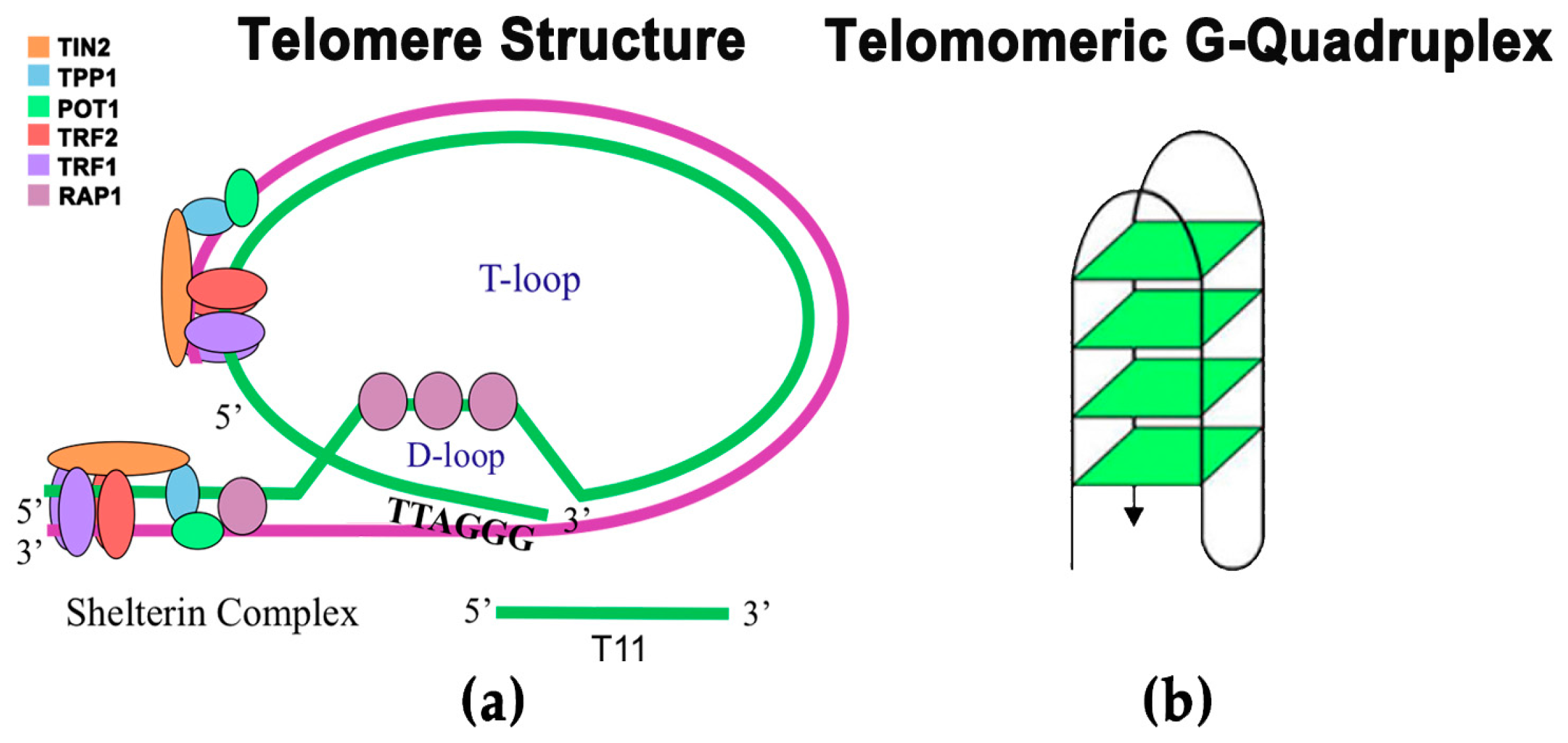 (a) Telomeric DNA has the ability to fold over itself, forming what is called the T-loop. Furthermore, the 3’ single-stranded overhang can tuck under itself, forming what is called the D-loop. Additionally, there are a group of regulatory proteins attached to the telomere at several locations, called the shelterin complex, which maintain telomere homeostasis; (b) Telomeric DNA forms intramolecular G-quadruplexes.