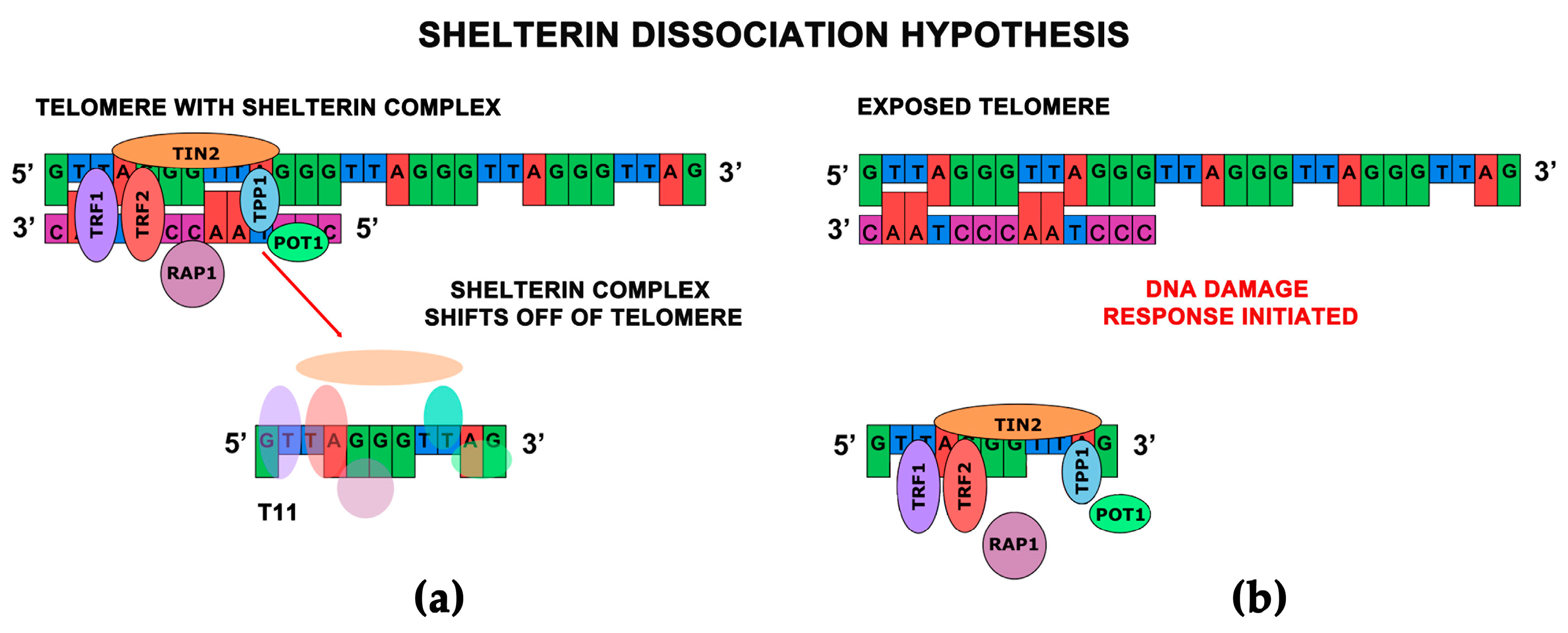 (a) The shelterin dissociation model hypothesizes that the presence of T11 in the nucleus causes the disruption of the telomere, particularly the shelterin complex. This model suggests that T11 competes with telomeric DNA for the binding of shelterin proteins; (b) Key proteins of the shelterin complex are displaced from the telomere and/or bind to T11. This disruption leaves the telomere exposed and initiates DDRs.