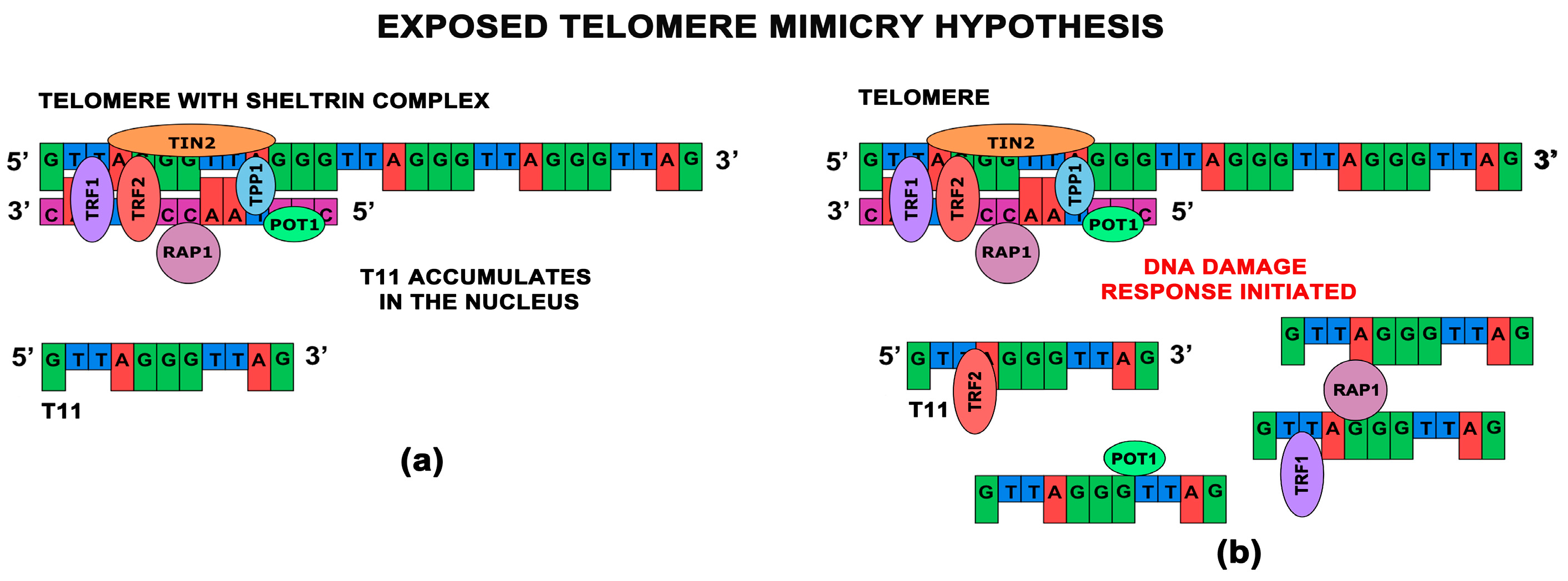 (a) The exposed telomere mimicry model hypothesizes that exogenous T11 mimics the exposed endogenous telomere overhang; (b) The cell responds to this mimicry of the telomere overhang exposure by initiating DDRs in cancer cells and triggering upregulation of shelterin proteins in attempt to overcome apparent telomere exposure.