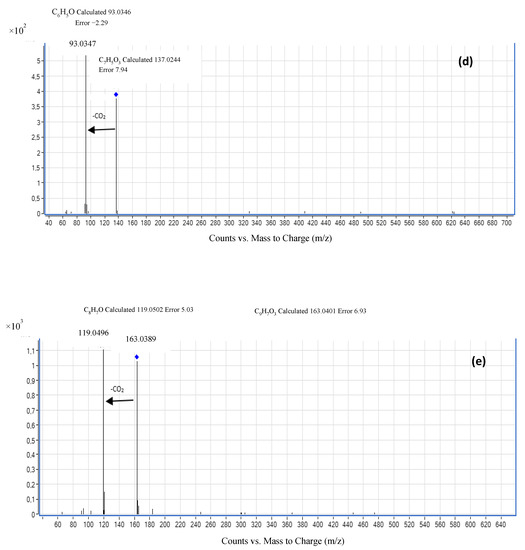 ESI (−)-MS/MS spectra corresponding to: catechin (a); quercetin (b); gallic acid (c); 4-hydroxybenzoic acid (d); and p-coumaric acid (e).