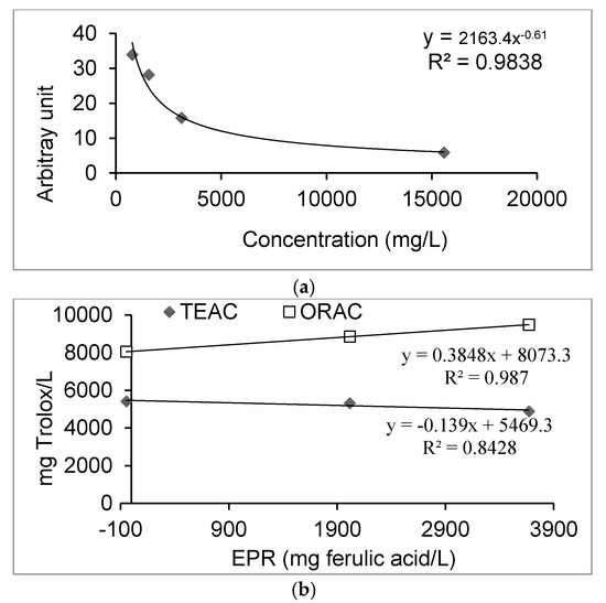 (a) Antioxidant activity determined by the electron paramagnetic resonance (EPR) assay for the CD (Caesalpinia decapetala) extract at different concentrations and (b) the correlation between the ORAC (oxygen radical absorbance capacity) and TEAC (trolox equivalent antioxidant capacity) assays with the EPR assay.