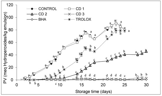 The PV of emulsion samples containing CD at concentrations of 0.02% (CD2) or 0.2% (CD3) was lower than that of the control or sample containing Trolox (0.02%), but with 0.002% (CD1), the emulsion deteriorated at a similar rate to the control (Figure 3). The emulsion stability, assessed by hydroperoxide formation, increased with increasing concentration of the natural extract. Emulsions containing extract concentrations of 0.02% and 0.2% showed a higher stability than those prepared with the positive Trolox control (0.02%), and the 0.2% extract exhibited a similar antioxidant effect to that of BHA at 0.004%.