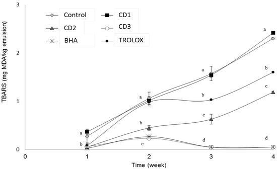 The TBARS value was measured in the fresh and stored emulsions when PV was measured, but the samples were collected once a week. Figure 4 shows the results obtained in the TBARS test. The extracts showed an effective antioxidant activity against the formation of sequential oxidation compounds, such as malondialdehyde. As expected, the TBARS values of the control sample and the CD1 extract increased rapidly, reaching values of 2.30 and 2.41 mg malondialdehyde/kg emulsion respectively at the end of the four-week study. The CD2 extract was able to reduce lipid oxidation by 50% with respect to the control. Finally, the treatments with the CD3 extract and with BHA showed the lowest TBARS values (0.05 mg malondialdehyde/kg emulsion), indicating the greatest ability to protect the emulsions against oxidation. In this way, the order of the TBARS values (from the least effective to the most effective sample) was CD1 > control > Trolox > CD2 > CD3 > BHA at the end of the storage period.