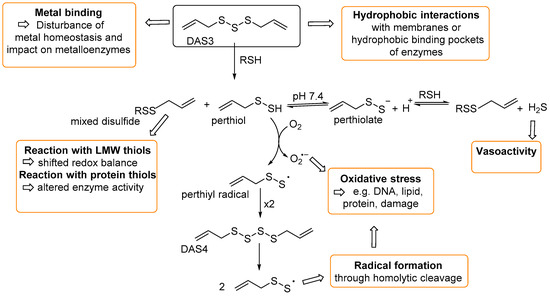 Despite their molecular simplicity, DAPS are able to exert their biological effects via an extensive range of reaction pathways (Figure 2). Once inside cells, DAPS can rapidly react (via thiol polysulfide exchange) with low molecular weight thiols (e.g., glutathione) and protein thiols to disrupt the cellular redox balance and enzyme function, respectively. Such reactions also liberate reactive perthiols, which can subsequently generate superoxide and perthiol radicals [6] that can cause oxidative damage to DNA, lipids, and proteins.