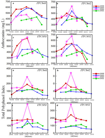 Anthocyanin content (mg/L) and total polyphenol index (IPT) (calculated by Institut Technique de la Vigne et du Vin (ITV) method) of four plots ITCS41 (a); ITCS42 (b); ITCS51 (c); and ITCS52 (d) of Cabernet Sauvignon grapes as a function of time (day (dd)/month (mm)) over four years (2008, 2009, 2010, and 2011).