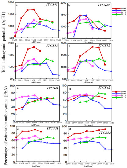 Total anthocyanin potential (AntpH1) and percentage of extractable anthocyanin (PEA) (calculated by Glories method) of four plots ITCS41 (a); ITCS42 (b); ITCS51 (c); and ITCS52 (d) of Cabernet Sauvignon grapes as a function of time (day (dd)/month (mm)) over four years (2008, 2009, 2010, and 2011).