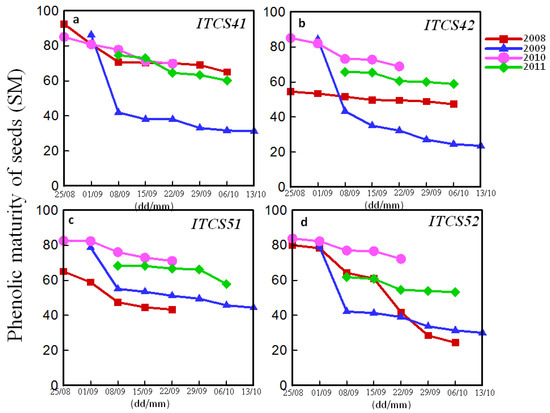 Seeds phenolic maturity of four plots ITCS41 (a); ITCS42 (b); ITCS51 (c); and ITCS52 (d) of Cabernet Sauvignon grapes as a function of time (day (dd)/month (mm)) over four years (2008, 2009, 2010, and 2011).