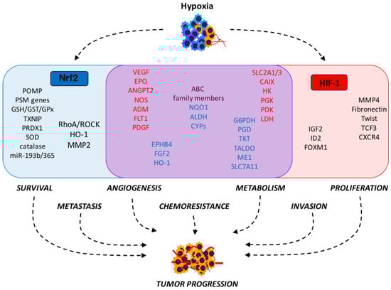 Tumor hypoxia activates Nrf2 and HIF-1 signaling to promote tumor progression through the activation of distinct and overlapping pathways. Through their respective target genes, Nrf2 and HIF-1 activate redundant pathways to stimulate angiogenesis, chemoresistance, and metabolic shifts, as well as unique pathways that contribute to tumor progression, such as survival and metastasis (Nrf2) and invasion and proliferation (HIF-1). Blue box: Nrf2 target genes; red box: HIF-1 target genes. Genes within the purple box (blue text: Nrf2 targets; red text: HIF-1 targets) contribute to redundant pathways. Purple text indicates classes of genes regulated by both Nrf2 and HIF-1. Nrf2: nuclear factor, erythroid 2-like 2; HIF-1: hypoxia inducible factor 1; POMP: proteasome maturation protein; PSM: proteasome; GSH: glutathione; GST: glutathione S-transferase; GPx: glutathione peroxidase; TXNIP: thioredoxin interacting protein; PRDX1: peroxiredoxin 1; SOD: superoxide dismutase: miR: microRNA; RhoA: Ras homolog family member A; ROCK: RhoA kinase; HO-1: heme oxygenase 1; MMP: matrix metalloproteinase; VEGF: vascular endothelial growth factor; EPO: erythropoietin; ANGPT2: angiopoietin 2; NOS: nitric oxide synthase; ADM: adrenomedullin; FLT1: Fms-related tyrosine kinase 1; PDGF: platelet-derived growth factor; EPHB4: EPH receptor 4; FGF2: fibroblast growth factor 2; G6PDH: glucose-6-phosphate dehydrogenase; PGD: phosphogluconate dehydrogenase; TKT: transketolase; TALDO: transaldolase; ME1: malic enzyme 1; SLC: solute carrier family; ABC: ATP-binding cassette; NQO1: NADPH: quinone dehydrogenase 1; ALDH: aldehyde dehydrogenase; CYP: cytochrome p450; CAIX: carbonic anhydrase IX; HK: hexokinase; PGK: phosphoglycerate kinase; PDK: pyruvate dehydrogenase kinase; LDH: lactate dehydrogenase; IGF2: insulin-like growth factor 2; ID2: inhibitor of DNA binding 2; FOXM1: forkhead box M1; TCF3: transcription factor 3; CXCR4: C-X-C motif chemokine receptor 4.