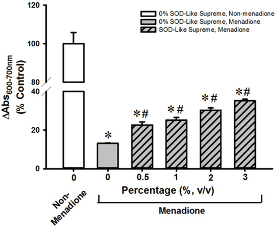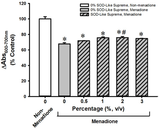 Effects of SOD-Like Supreme on cell viability of AML12 cells following menadione challenge. After the co-incubation of AML12 cells with SOD-Like Supreme and menadione, cell viability was assessed by the MTT assay, as described in Materials and Methods. The difference between absorbance at 600 nm and absorbance at 700 nm of non-menadione controls is 1.10 ± 0.03 (mean ± standard error of the mean (SEM) Data are expressed as % of the non-menadione controls by normalizing relative to the value of the non-menadione-incubated cells. Values given are means ± SEM, with n = 8. * Significantly different from the non-menadione controls; # Significantly different from the menadione control group.