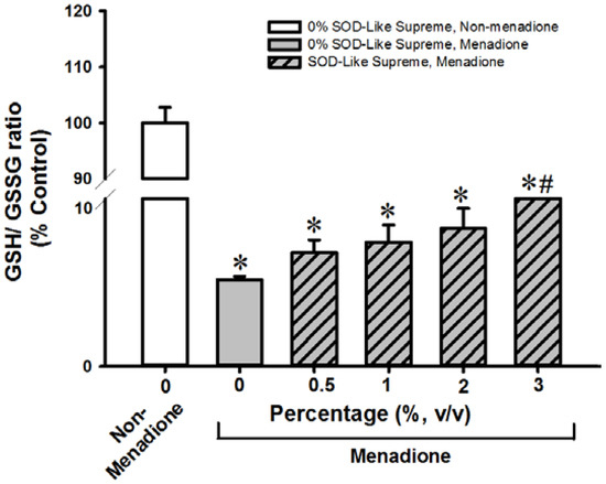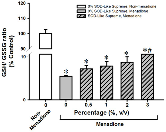 Effects of SOD-Like Supreme on cellular GSH/GSSG ratio in AML12 cells following menadione challenge. After the co-incubation of AML12 cells with SOD-Like Supreme and menadione, cellular GSH/GSSG ratios were measured, as described in Materials and Methods. The GSH/GSSG ratio of the non-menadione controls is 71.0 ± 2.0 (mean ± SD). Data are expressed as % of the non-menadione controls by normalizing relative to the value of the non-menadione-incubated cells. Values given are means ± SD, with n = 4. * Significantly different from the non-menadione controls; # Significantly different from menadione control group.