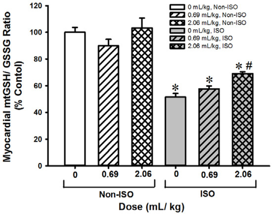 Effects of SOD-Like Supreme treatment on myocardial mitochondrial GSH/GSSG ratio in ISO-challenged mice. After treatment of ISO-challenged mice with SOD-Like Supreme, myocardial mitochondrial GSH/GSSG ratios were measured, as described in Materials and Methods. The GSH/GSSG ratio of the non-ISO control group is 14.7 ± 0.6 (mean ± SEM). Data are expressed as % of the non-ISO controls by normalizing relative to the value of the non-ISO control group. Values given are means ± SEM, with n ≥ 9. * Significantly different from the non-ISO controls; # Significantly different from the ISO control group.