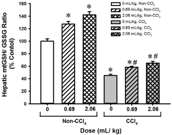 Effects of SOD-Like Supreme treatment on hepatic mitochondrial GSH/GSSG ratio in CCl4-challenged mice. After the SOD-Like Supreme treatment in CCl4-challenged mice, hepatic mitochondrial GSH/GSSG ratios were measured as described in Materials and Methods. The GSH/GSSG ratio of the non-CCl4 control group is 14.7 ± 0.6 (mean ± SEM). Data are expressed as % of the non- CCl4 control by normalizing relative to the value of the non- CCl4 control group. Values given are means ± SEM, with n ≥ 9. * Significantly different from the non-CCl4 controls; # Significantly different from CCl4 control group.