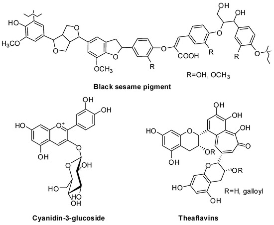 On the other hand, in many other cases, such as black rice, black beans, sunflower and grapes, structural formulations indicated anthocyanins as mainly responsible for the color observed, whereas catechin polymers were identified as the main components of black tea pigments [18,19,20,21,22,23,24] (Figure 2).