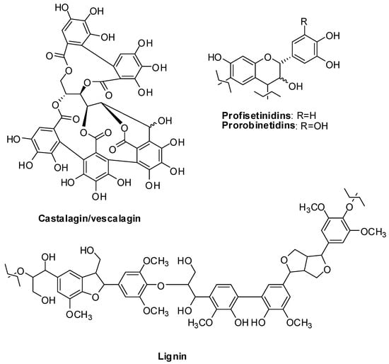 Wood has traditionally represented a rich source of biopolymers. Tannins of tropical woods are typically of the catechol type, whereas those present in temperate woods are of the gallic type. Most investigated are oak tannins that can be easily extracted by repeated treatment with hot water and are composed mainly of hydrolyzable gallotannins including grandinin/roburin E, castalagin/vescalagin, gallic acid, valoneic acid bilactone, monogalloyl glucose, digalloyl glucose, trigalloyl glucose, ellagic acid rhamnose, quercitrin and ellagic acid [29] (Figure 4). Gallotannins including vescalagin and castalagin represent the major constituents also of chestnut tannins [30].