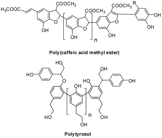 Peroxidase-catalyzed polymerization of natural phenols is attracting growing interest as a means to produce biocompatible and stable functional polymers under mild and eco-friendly reaction conditions [72,73,74]. The reaction on monophenolic substrates proceeds via one-electron oxidation leading to the generation of phenoxyl radicals intermediates, which evolve via sequential oxidative coupling steps [75]. Horseradish and soybean peroxidase were used for polymerization of m-cresol [76], cardanol [77] and guaiacol [78]. Other relevant examples of bioinspired phenolic polymers include poly(caffeic acid methyl ester) [79], poly(pyrogallic acid) [80,81] and polytyrosol [82] (Figure 5).