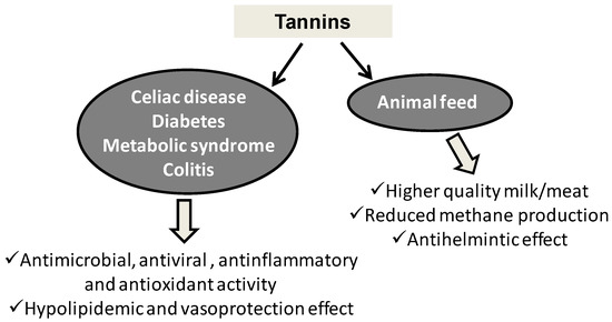 An overview of the main applications and effects of tannins as food supplements is shown in Figure 6.