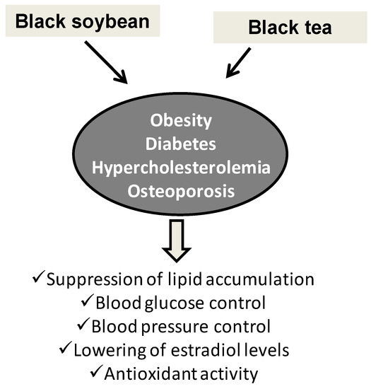 An overview of the main applications and effects of black soybean and black tea as food supplements is shown in Figure 7.