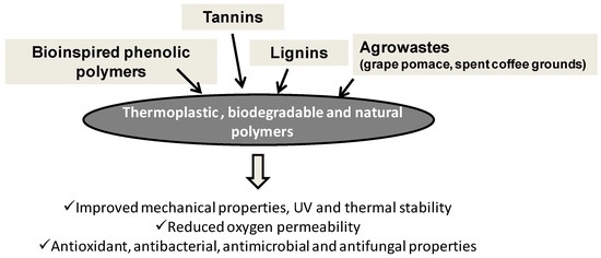 Natural phenolic polymers, primarily lignins from wood processing or from lignocellulose wastes, were recently widely explored to confer desired characteristics to traditional or biodegradable polymers used for packaging. Improved properties, e.g., higher viscoelastic and tensile characteristics, reduced oxygen permeability and increased UV resistance, of biodegradable plastics, like poly(3-hydroxybutyrate-co-3-hydroxyvalerate) [155,156], polylactic acid [157] and alginate [158], have been obtained following their processing with kraft lignins or composites fabrication. Furthermore, in the case of polyethylene, blending with kraft lignins improves the thermal stability [159]. Formulations of low cost oxo-biodegradable polyethylene-lignin hybrid composites were prepared starting from ethylene/vinyl acetate copolymer as the compatibilizer and a transition metal salt as the oxo-biodegradation promoter [160]. Films prepared from nanocomposites of lignin and cellulose nanocrystals that combine the oxygen barrier property of cellulose nanocrystal films with the antibacterial property of lignin are also promising materials in food and medical applications [161]. Other agro-wastes rich in antioxidants, such as grape pomace waste, turmeric shavings and waste, spent coffee grounds and orange peel waste were tested as finely-grounded powders without any work-up or purification step as thermo- and photo-oxidative stabilizers for low density polyethylene [66,162]. Similarly, condensed tannin extracts from Pinus radiata and Acacia mearnsii compounded into linear low-density polyethylene films improved UV stability during accelerated weathering, with greater strength and elongation retention [163].