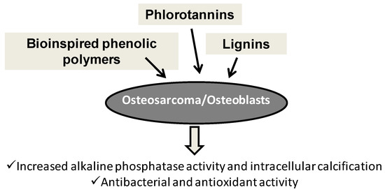 Several phenolic polymers were evaluated as biomaterial additives to favor cell growth and differentiation. Thanks to their antioxidant and antimicrobic properties, polyphenols were extensively investigated as promoters of osteoblast differentiation, since they can counteract the inhibitory effects of reactive oxygen species (ROS) on the process of bone formation by osteoblastic cells. Brown algae phlorotannins, such as triphlorethol A, eckol and dieckol, proved effective in enhancing the osteoblast differentiation as indicated by increased alkaline phosphatase activity along with raised levels of osteoblastogenesis indicators and intracellular calcification [177]. Similarly, polytyrosol, a mixture of oligomers from enzymatic tyrosol oxidation, stimulated alkaline phosphatase activity of osteosarcoma SaOS-2 cells at Day 7 also when loaded at 5% w/w into highly porous polylactic acid scaffolds featuring hierarchical structures, while tyrosol was completely inactive [82].
