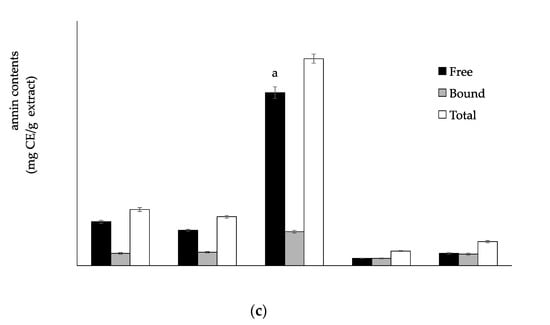 Phenolic (a), flavonoid (b), and tannin contents (c) of free and bound phenolic extracts and their total contents in C. crenata. Different letters within the same color columns indicate significant differences (p < 0.05).
