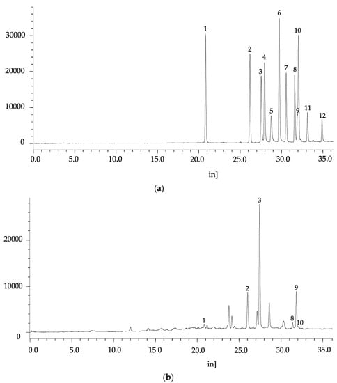 HPLC chromatograms of flavonoid standard mixture (a) and bound flavonoids of flower extract (b). Peak 1: esculetin; 2: isoquercitin; 3: myricetin, 4: fisetin; 5: morin; 6: quercetin; 7: luteolin; 8: kaemferol; 9: isohamnetin; 10: apigenin; 11: rhamnetin; 12: galangin.