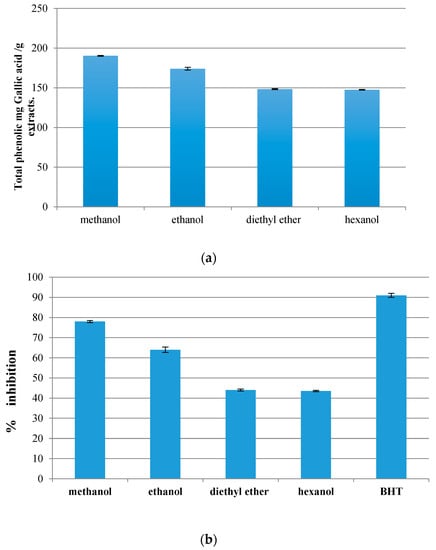 The total phenolic content of the olive leaves was expressed and presented in terms of mg gallic acid/g extracts (Figure 1a). The obtained results showed that the amount of phenolic compounds of the olive leaf were 190.44 ± 0.50, 173 ± 1.72, 147.78 ± 0.69, and 147.50 ± 0.05 mg gallic acid/g extracts using methanol, ethanol, diethyl ether, and hexanol, respectively. The statistical analysis revealed that there was a significant difference in the phenolic contents in terms of the solvents used. Among all the solvents, methanol extraction gave the highest amount of phenolic compounds followed by ethanol extraction, while the lowest amount of phenolic compounds was obtained using either diethyl ether or hexanol extraction. These results were in agreement with Zhou and Yu [], who mentioned that using polar solvents could surely enhance and provide the highest amount of phenolic compounds in the examined plants.