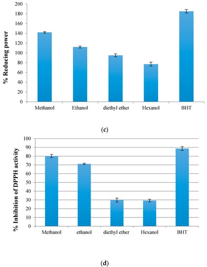 First, the antioxidant activity of the olive leaf extracts was investigated using the DPPH scavenging method by measuring the total antioxidant capacity. In this study, the effectiveness of the olive leaf extracts using different solvents was compared with the synthetic antioxidant BHT. The methanol extract of the olive leaves had a significant effect (80.166% ± 1.75) on the inhibition of DPPH activity among all the solvents used (Figure 1d). In contrast, BHT exhibited the highest antioxidant activity (88.67% ± 2.08) by decolorizing the DPPH reagent and then changing the absorbance reading positively. Both diethyl ether and hexanol extracts were found to be less active against DPPH (29.83% ± 2.25, 29.33% ± 1.53), respectively. This finding was similar to that of Gkanatsiou et al. [], who found that more polar solvents had the ability to penetrate and dissolve more polar phenolic compounds from the olive leaf. The obtained results were not in an agreement with Hamad [], who reported that the percentage of inhibition of the Saudi olive leaf was (51.72% ± 0.66) using ethanol extraction. The reason may be ascribed to the differences between the cultivars used.