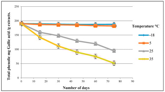 Figure 2 shows the estimated variation of the total phenolic content of the methanol extraction of the olive leaves. The differences between the stored samples were investigated using the T-test at 95% confidence level. The statistical analysis found that there was no significant difference (p > 0.05) between the stored samples at the freezing temperature at −18 °C nor the cooling temperature at 4 °C for up to 75 days. However, the obtained results revealed that there was a significant difference (p < 0.05) between both 25 °C and 35 °C. The total recovery of phenolic compounds for both 25 °C and 35 °C was 49.75% and 27%, respectively, when the olive leaf extract was stored for 75 days. This result indicated that increasing the storage temperature could negatively affect and encourage the degradation of the phenolic compounds. These findings were in an agreement with Obied et al. [] who studied the effect of the storage condition on the phenolic compound and antioxidant activity of olive mill waste.