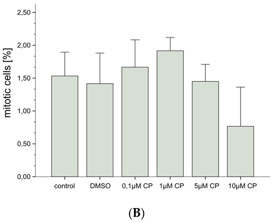 Figure 2A shows the dose response of both apoptosis and necrosis induction by CPs (prepared by NaClO degradation). Up to a concentration of 5 µM there is no significant increase of apoptotic cells, although there is a trend to higher rates. At a concentration of 10 µM CPs, a significant increase (p < 0.05) of apoptotic cells is observed. The increased levels of apoptotic cells at the highest CPs concentration applied are accompanied by a trend to lower proliferation rates as indicated by the mitotic indices (Figure 2B). Due to high variations between the experiments, necrotic cells were not significantly elevated, even at a concentration of 10 µM CPs.