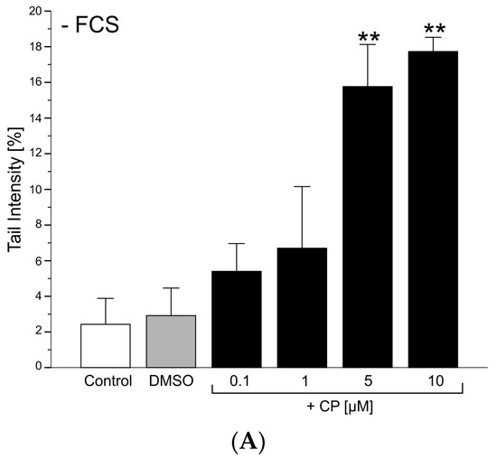 Effects of CPs on DNA-damage in primary cultures of rat pneumocytes; (A) treatment in the absence of FCS; (B) treatment in the presence of FCS; *: p < 0.05; **: p < 0.005 compared to the DMSO control (ANOVA, Tuckey post-hoc testing); N = 3.