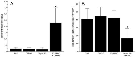 (A) Adherent dead cells and (B) changes of cell density in pneumocyte type II cell cultures treated with different concentrations of BC in the presence of 5 µM DMNQ. Data represent the means ± SD of at least 3 independent experiments; *: p < 0.05 compared to all controls.