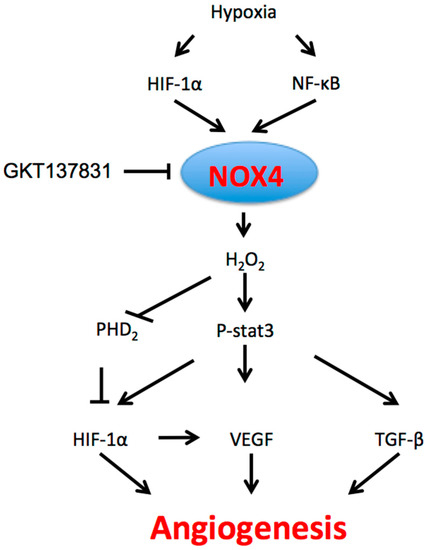 Angiogenesis is necessary for the invasive growth and metastasis of tumors and is an important target in the control of cancer progression [70]. Compelling evidence demonstrates that NOX4 and its generated ROS have a close relation to tumor angiogenesis in different cancers. In a carcinogen 3-methylcholanthrene (MCA)-induced fibrosarcoma mice model, there is a significant 38% reduction in tumor vascularization in fibrosarcomas of NOX4−/− mice [56]. The accumulation of HIF-1α and the expression of the HIF-1α-dependent pro-angiogenic genes such as VEGF-A, glucose transporter 1 (GLUT-1) and adrenomedullin are indeed significantly attenuated in tumors of NOX4−/− mice compared to wild type (WT) mice. HIF1α is a key transcription factor of angiogenesis in solid tumors [71,72] and tumors lacking HIF-1α show significantly reduced vascularization [73]. NOX4 promotes tumor angiogenesis by stabilization of HIF-1α and induction of VEGF expression [56]. In von Hippel Lindau (VHL)-deficient renal cell carcinoma (RCC), NOX4 also promotes renal tumorigenesis in a similar signal pathway via nuclear accumulation of HIF-2α, not HIF-1α [74]. HIF1α expression is biased toward HIF2α [75], whose transcriptional activity is dependent on NOX4 in VHL-deficient RCC [76]. Stable NOX4 knockdown by shRNA significantly reduces ROS production and suppresses glioblastoma cells proliferation and invasion and tumor-associated angiogenesis [77]. Taken together, NOX4 is implicated in tumor angiogenesis of different cancer types, including fibrosarcoma, VHL-deficient RCC, glioblastoma and human astroglioma [78]. Therefore, NOX4 might be a promising target for anti-angiogenic tumor therapy.
