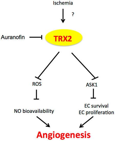 Apoptosis and cell survival are critical components in angiogenesis and vascular remodeling, which can be regulated by the TRX system. TRX1/2 inhibit apoptosis in both a redox-dependent (by scavenging ROS enhancing NO activity) and a redox activity independent manner (by inhibiting ASK1) [96]. This was elucidated by crossing TRX2-TG with eNOS-deficient or ASK1-deficient mice [100]. Conversely, overexpression of ASK1 in ECs inhibits cell migration and vascular network formation induced by VEGF [102]. Of note, ASK1-interating protein-1(AIP1)-deficient mice have enhanced ischemia and inflammatory angiogenesis in ischemic hind limb and sponge granuloma models [103].